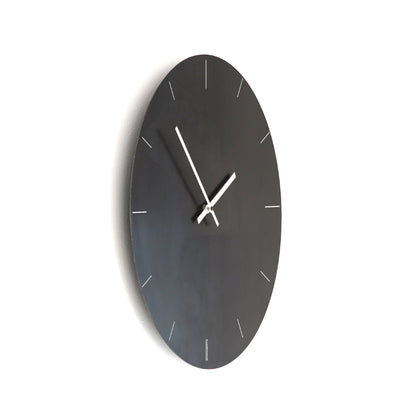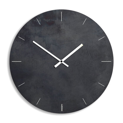Die Zeiger aus satiniertem Weißmetall heben sich von einem großen Zifferblatt aus schillerndem dunkelgrauem Calamin-Stahl ab und erzeugen einen Kontrast mit starker optischer Wirkung.