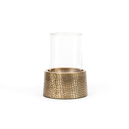 Dieser stilvolle Kerzenhalter aus Messing mit Glasschaft verleiht Ihrem Couchtisch, Kamin oder sogar Ihrem Badezimmer ein Element von Spaß und Design. Dieses Dekostück mit Kroko-Print wurde mit Liebe zum Detail gefertigt und bietet Platz für eine mittelgroße Kerze. Kroko-Print ist immer im Trend!