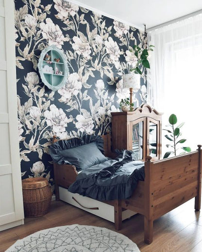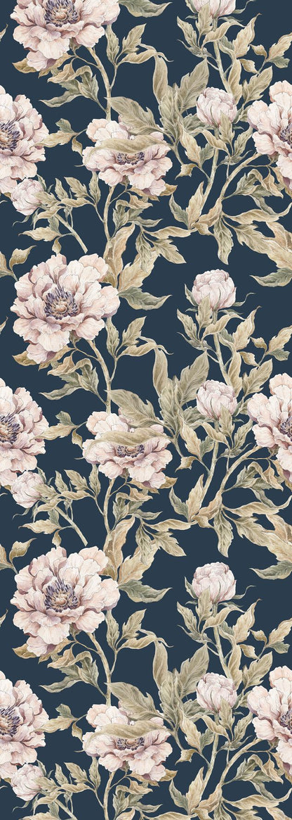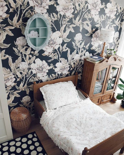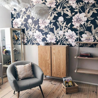Große Pfingstrosen, ein wunderschönes Muster von Kasia Góraj-Stróżyńska. Große Blumen lassen das Muster auf Wänden, die breiter als 150 cm sind, wunderbar aussehen. Die größten Pfingstrosen sind etwa 45 cm groß, was bedeutet, dass wir selbst auf einer großen Fläche nicht den Eindruck eines überwältigend dichten Musters haben.