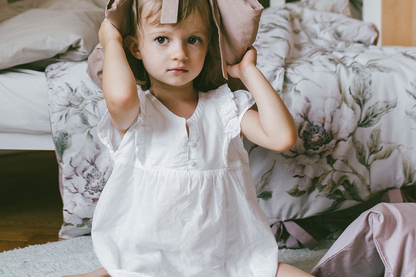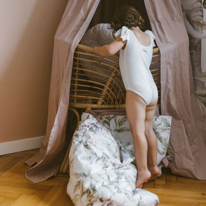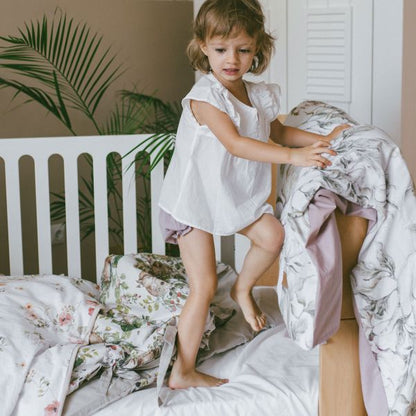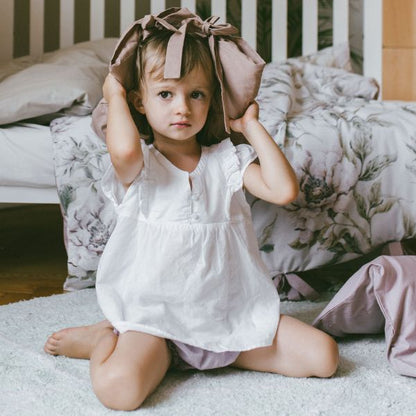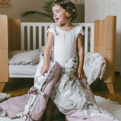 Sowohl die Bettdecken als auch die Kissen sind mit Schleifen und Schnüren gebunden. Das ist für uns eine Ehrensache, denn wer unsere Marke bereits kennt, weiß auch, dass wir weder bei unseren Vorschlägen für Sperrholzspielzeug noch jetzt bei der Bettwäsche gefährliche Elemente akzeptieren. Daher hat diese Bettwäsche keine Reißverschlüsse, Knöpfe oder Druckknöpfe. Nichts darf ein Baby zerkratzen oder herunterfallen. Wir haben nur etwas mehr Material hinzugefügt, damit es sich schön umhüllt und die Füllung schützt (20 cm Material innen umwickelt), und schließlich binden wir Schleifen, die einen Retro-Look verleihen.