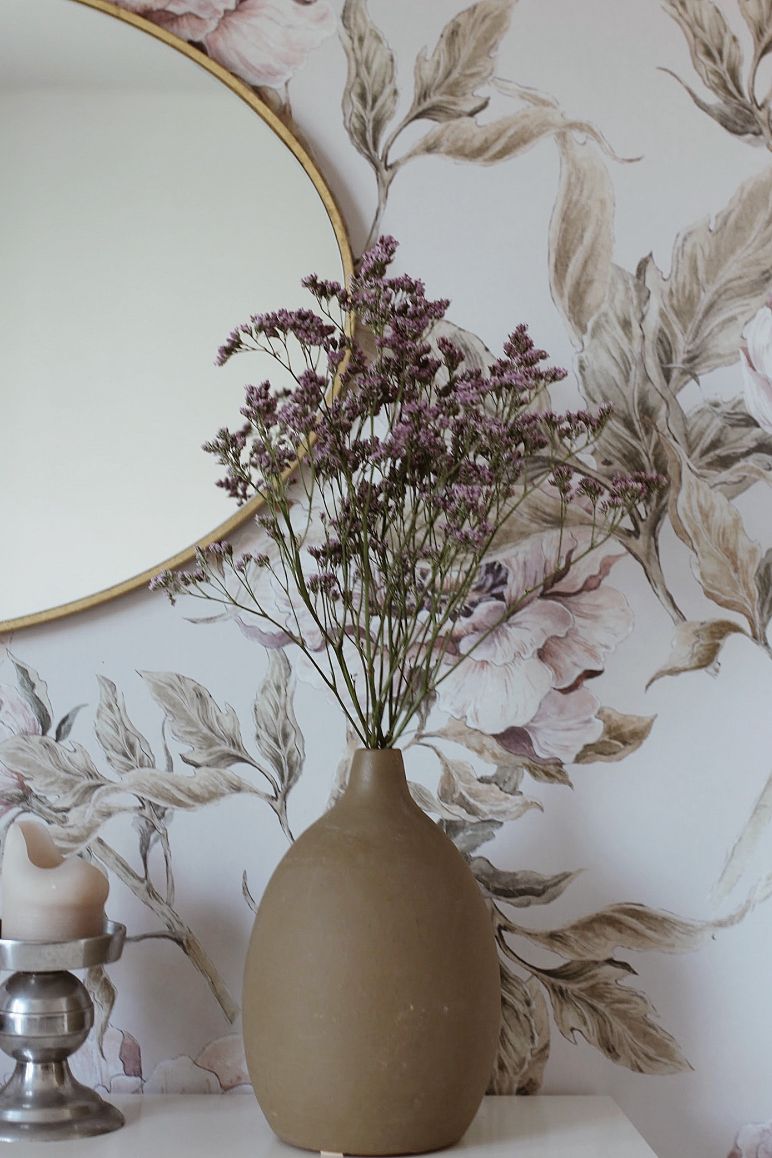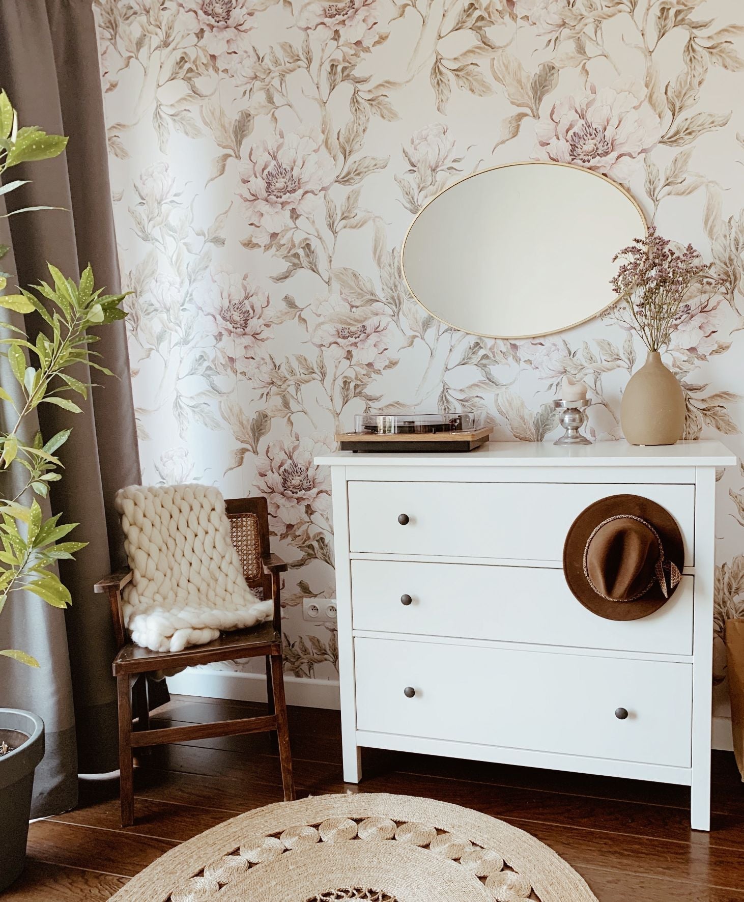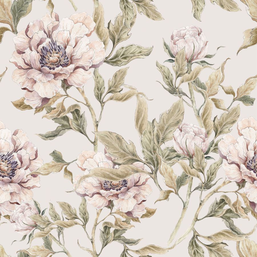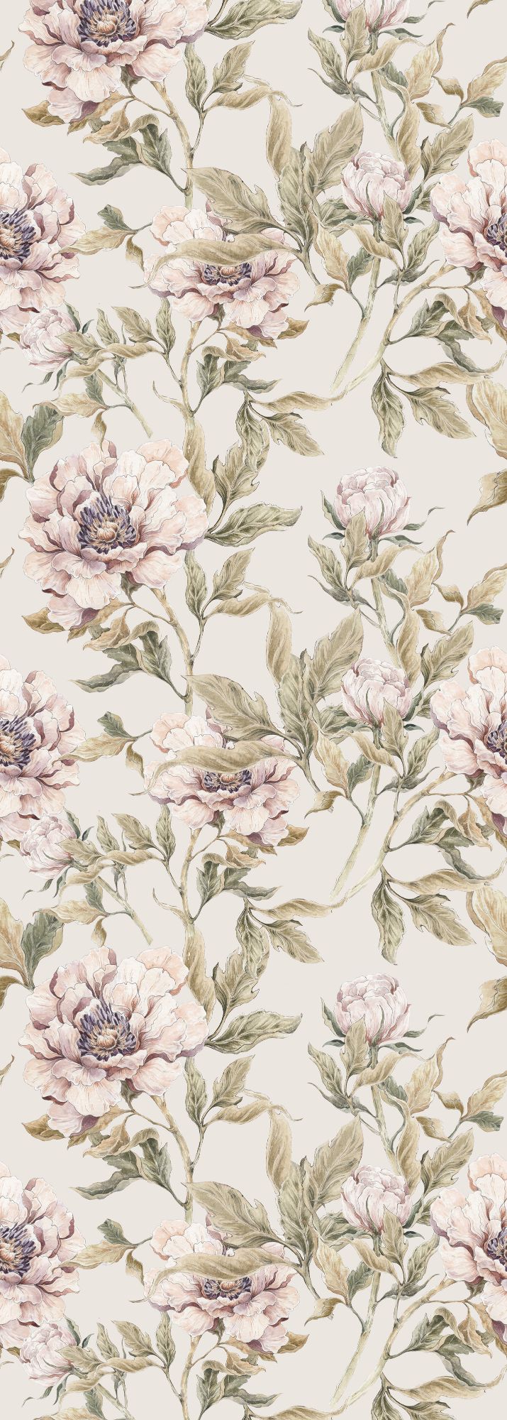 Maxi-Muster haben uns schon immer gefallen, deshalb entstand diese wunderbare Arbeit als Tapete mit größerem Muster und in breiten Streifen – 100 cm. Große Blumen lassen das Muster auch auf breiten Wänden, sogar über 150 cm, wunderbar wirken. Die größten Pfingstrosen sind etwa 45 cm groß, sodass wir auch auf einer großen Fläche nicht den Eindruck haben, dass das Muster zu dicht ist.