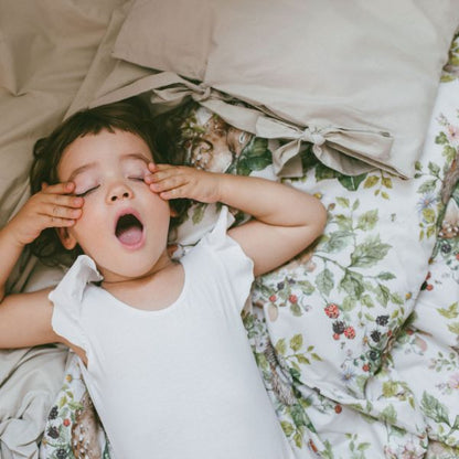 Die Bettlaken sind aus bedrucktem Stoff und einem einfarbigen Stoff genäht, der die Farben des Drucks ergänzt. So können Sie eine Bettdecke entweder im Savanna- oder im Beige-Druck haben, je nachdem, welche Seite der Bettdecke Sie als Vorderseite wählen. Im Set finden Sie auch ein einfarbiges Kissen in der gleichen Farbe wie die Bettdecke. In Zukunft planen wir auch bedruckte Kissen, die zum Kauf angeboten werden.