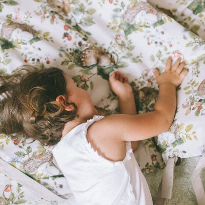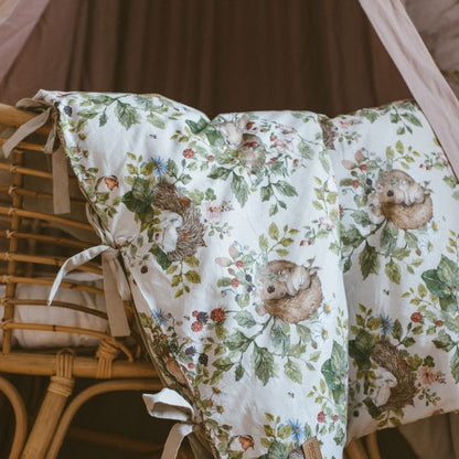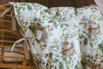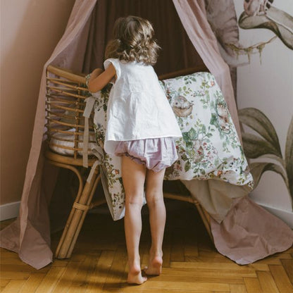 Sowohl die Bettdecken als auch die Kissen sind mit Schleifen und Schnüren gebunden. Das ist für uns eine Ehrensache, denn wer unsere Marke bereits kennt, weiß auch, dass wir weder bei unseren Vorschlägen für Sperrholzspielzeug noch jetzt bei der Bettwäsche gefährliche Elemente akzeptieren. Daher hat diese Bettwäsche keine Reißverschlüsse, Knöpfe oder Druckknöpfe. Nichts darf ein Baby zerkratzen oder herunterfallen. Wir haben nur etwas mehr Material hinzugefügt, damit es sich schön umhüllt und die Füllung schützt (20 cm Material innen umwickelt), und schließlich binden wir Schleifen, die einen Retro-Look verleihen.