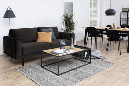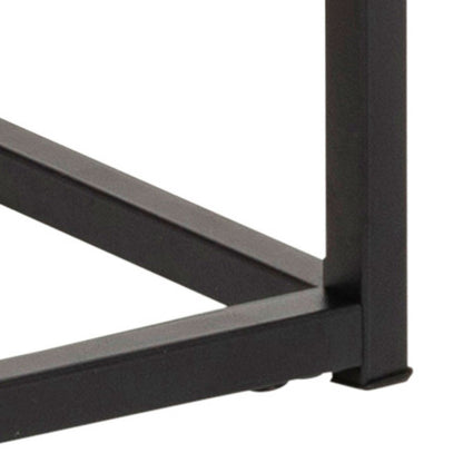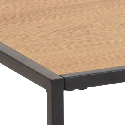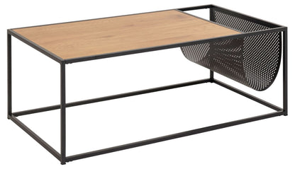 La mesa de centro Fjord Newspaper combina el marco de metal negro con estantes de madera, creando una sensación industrial.