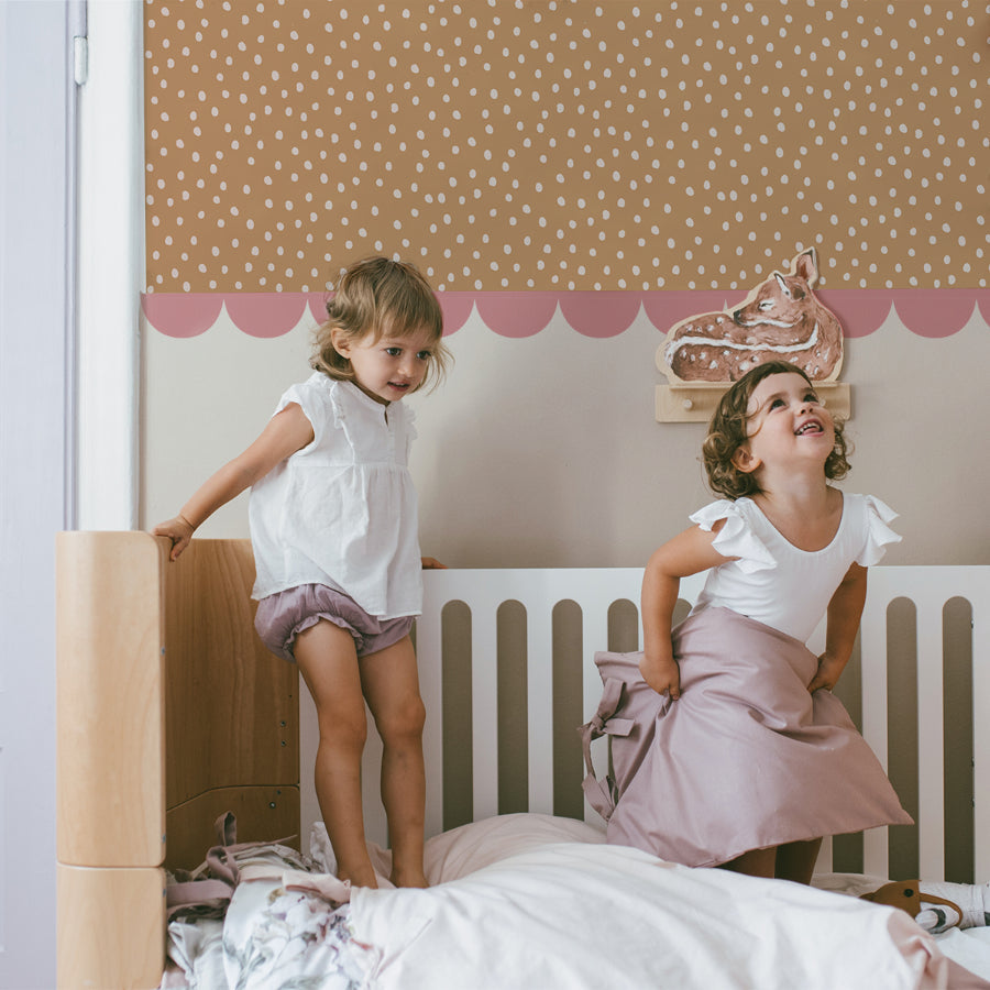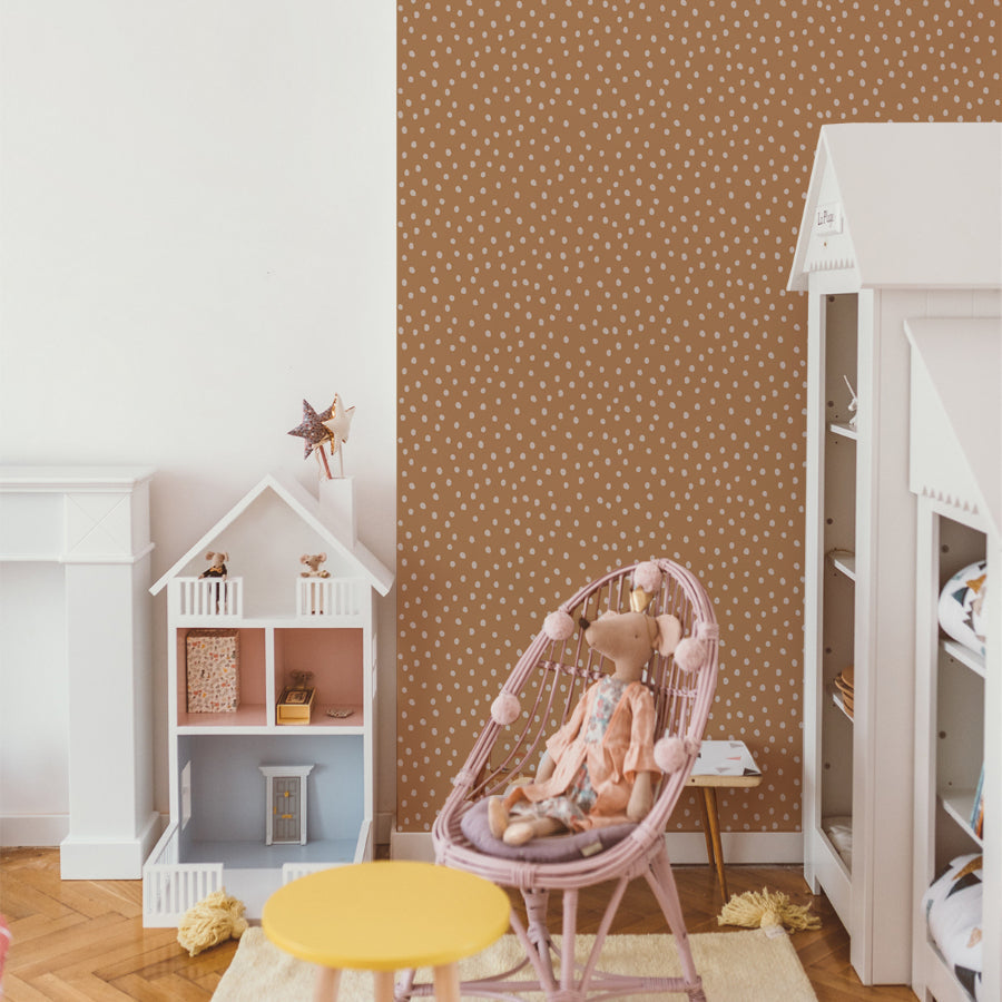 El papel pintado IRREGULAR DOTS se parece un poco al pelo de un ciervo, un poco al pelaje de un geópedo y un poco a... la lluvia. Es un papel pintado muy bonito, uno de nuestros favoritos.