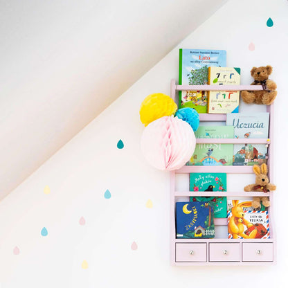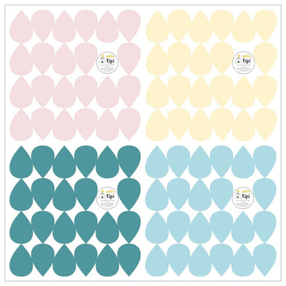 En los mini sets combinamos los colores que creemos que son los más adecuados para los interiores de los niños. Hemos preparado 92 pegatinas con forma de gota en 4 colores: rosa claro, vainilla, menta y azul. Cada color está en una hoja independiente.