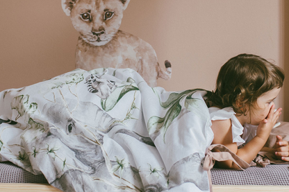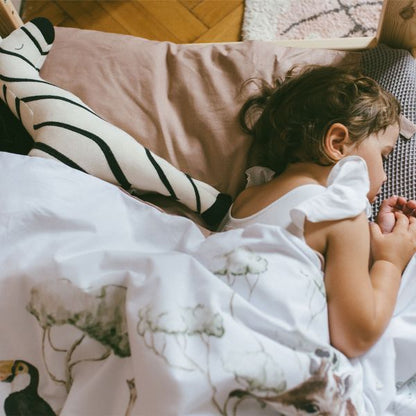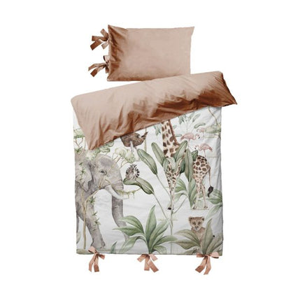 The bedsheets are sewn from printed material and from a single-color material selected to complement the colours of the print. Thus, you can have a quilt either in Savanna or beige print, depending on which side of the quilt you choose to be the front one. In the set you will also find a one-color pillow in identical colour as the the colour of the quilt. In the future, we also plan overprinted pillows, available for purchase.