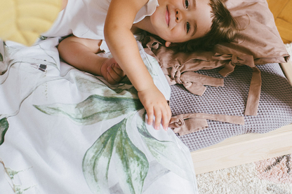 Both quilts and pillows are tied with bows and strings. We have made this our point of honor because if you already know our brand, you also know that we do not accept dangerous elements both in our proposals for plywood toys and now - in bedding. Therefore, these bedding does not have zippers, buttons, or snaps. Nothing has the right to scratch a baby or to fall off. We just added a little more material so that it wraps beautifully and protects the filling (20 cm of material wrapped inside), and finally, we tie bows that add a retro look.