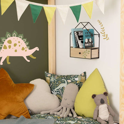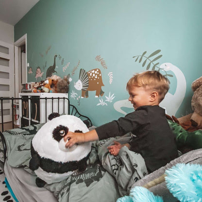 It is an imagination-stirring sticker set with characters of charming dinosaurs in various sizes. Stick the larger ones at the bottom of the wall or behind the bed. Smaller ones will also look great on furniture, over a shelf or a desk. Our dino friends are herbivores, so you will also find some leaves and flowers in the set.