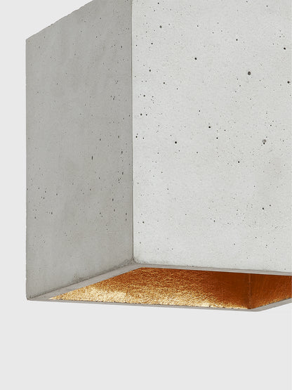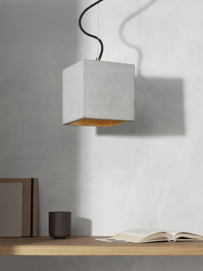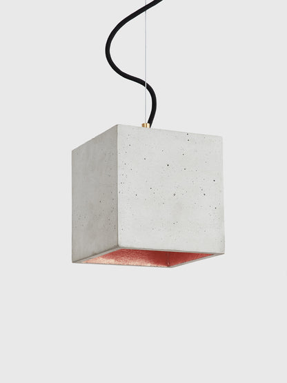 The cubic pendant lamp [B5] is cast from light grey concrete and comes with a gold, silver or copper plating on the inside.