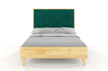 FRIDA wooden pine bed was designed for people who value resting in bed also during the day. FRIDA is a very elegant piece of furniture. It has a high headrest with a thick wooden frame, which the front part was upholstered with a velour fabric pleasant to the touch. The upholstery is quilted in the shape of rectangles. On the headrest, you can lean on the pillow and enjoy reading books or watching TV, even for a long time. Important is the fact that despite the high headrest (130 cm) its construction is very strong and stable.