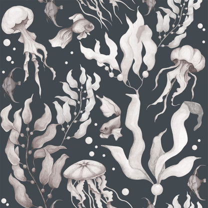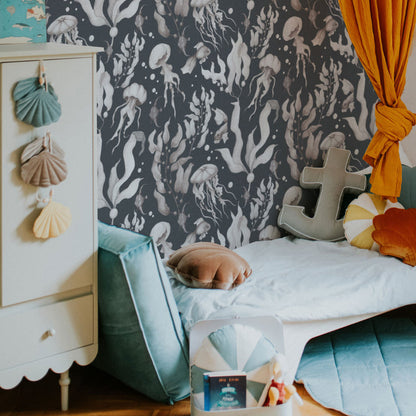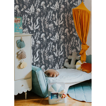 The design of WALLPAPER MAGIC OF OCEAN has been for a long, long time on our minds. We’ve always wanted to create a super delicate marine wallpaper. Wallpaper on a very dark navy blue background was chosen… by you!