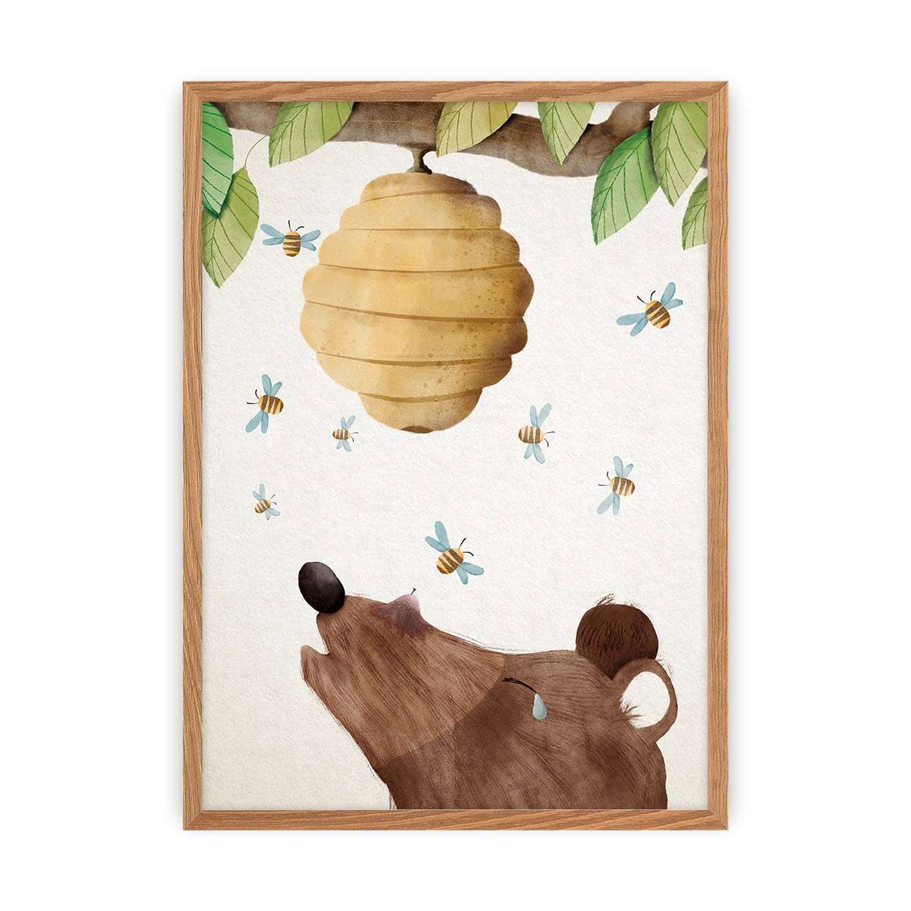 Unusual picture for children depicting a greedy bear. It is part of a lovely story told through the Forest Story series. This watercolour painting features beautiful, warm colours and a unique design. Decorated in warm colours of brown and yellow. It is framed in a wooden frame, so it will look beautiful on the wall. We recommend other pictures from the same series to complete the set. Dimensions: 30 x 40 cm