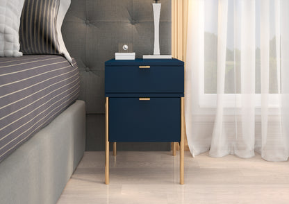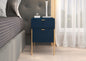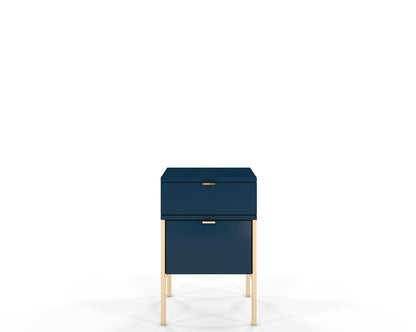 The Skandica POLKA bedside table is made of a furniture board in the colors of intense navy blue which perfectly match the golden construction elements. The structure rests on four metal legs that overlap the edges of the furniture and climb up to the half of its height. The Skandica POLKA bedside table is equipped with two spacious drawers, which have a soft close function. They are located on invisible guides, thanks to which these not very aesthetic elements are practically invisible. In addition, high legs and low weight allow for easy cleaning around the table.