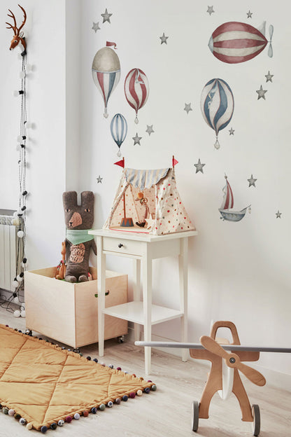 Sky is The limit is a set of seven large elements. They bring to the room an atmosphere of adventure, magic, travel and the feeling of endless possibilities. The French colours we’ve chosen, red, white, and blue, makes the stickers not too childish and cartoon-like but rather with classic, and classy, decorations.